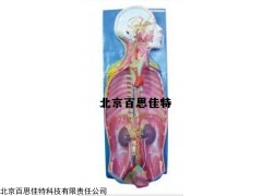 神經解剖模型主題為人體的頭頸及軀干,頭部作矢狀切面至眉弓高度作水平切,顳下部除去上方的顴弓,顳下部的腮腺及部分軟組織,頸部示剝離軟組織,胸腹部沿腋前線削開胸腹壁,除去胸腹腔內臟,保留氣管、主動脈、腎、腎上腺以及直腸。
