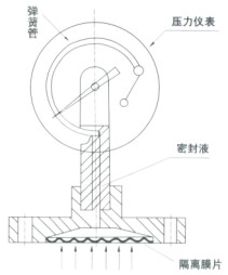 為了擴大各種通用型壓力儀表的使用范圍,能適用于測量強腐蝕、高溫、高粘度、易結晶、易凝固和有固體浮游物介質的壓力,以及對某些測量介質不能直接進入通用型儀表內和便于清洗防止沉淀物持積聚的場合的壓力檢測時,必須采用由隔膜隔離器與通用型壓力儀表組成一個系統的隔膜表。 |