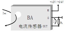 如圖所示穿心輸入Iac,電流輸出型傳感器的輸出為共地電流源,電壓輸出型傳感器的輸出為共地電壓源。圖中RL是用戶負(fù)載,輸出為電流時,負(fù)載≤400Ω(12V供電)或≤800Ω(24V供電);輸出為電壓時負(fù)載≥1kΩ。