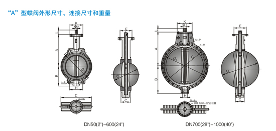 注:DN50(2")~800(32")“A”型蝶閥分別適用于PN1.0/PN1.6MPa二種壓力級,表中每格有兩個尺寸的分別表示PN1.0/PN1.6MPa二種壓力級連接尺寸。與閥門連