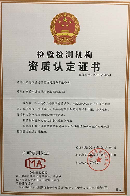 世通檢測于2015年在廣東東莞成立,從2005年10月獲得CNAS證書,迄今為止,世通檢測獲得了多張考核認可證書,檢測范圍覆蓋長度類、力學類、光學類、幾何量類、熱學類、電學類、電磁類、理化類等多個領域,能夠測試的項目也在逐步擴大。世通檢測自成立以來為很多的客戶提供了服務,得到廣大客戶所認可,充分體現了“一次認可,通行”的認證認可效益。