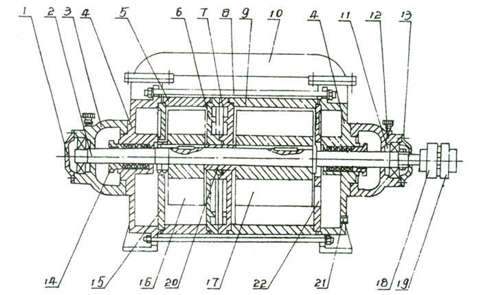 | 1、后軸承壓蓋 2、軸 3、軸承架 4、前后端蓋 5、短泵體 6、中間壁(B) 7、中間壁(A) 8、拉緊螺栓 9、長泵體 10、連通管 11、調整墊 12、油杯 13、前軸承壓蓋 14、填料壓蓋 15、后蓋園盤 16、短葉輪 17、長葉輪 18、泵聯軸器 19、電機聯軸器 20、軸套 21、進水孔 22、前蓋園盤 |