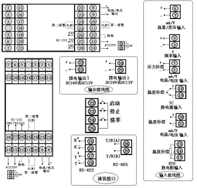 過熱蒸汽帶溫度壓力補償的5位流量積算控制儀,流量輸入類型為4~20mA,壓力補償輸入類型為1~5V,溫度補償輸入類型為熱電偶K型,繼電器控制輸出,帶RS-485通訊,帶流量定量到控制報警輸出,帶下限報警輸出,帶DC24V饋電輸出