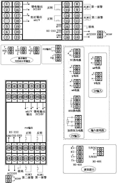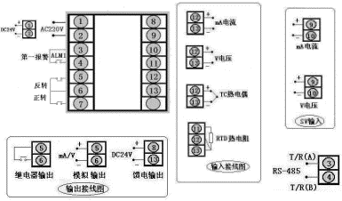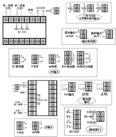 外給定控制,通訊方式RS232,輸出方式繼電器輸出,PV輸入類型為Pt100,SV輸入類型為4~20 mA,一報警為上限報警,第二報警為下限報警,DC24V饋電輸出,供電方式為直流24V供電。