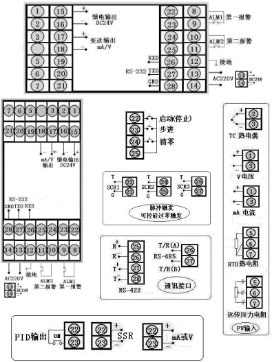 通訊方式為RS-232,輸出方式為繼電器輸出,輸入類型為Pt100.1,一報警為上限報警,第二報警為下限報警,DC24V饋電輸出,DC24V供電,豎表。