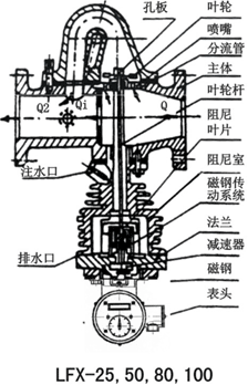 被測蒸汽流經(jīng)流量計(jì)本體:時由孔板節(jié)流,在前后壓差的作用下,一部分蒸汽通過噴嘴進(jìn)入分流管噴嘴形成的射流推動轉(zhuǎn)子軸以上端的翼輪旋轉(zhuǎn),轉(zhuǎn)子軸下端有兩阻尼葉片在注滿阻尼液的阻尼室中作阻尼轉(zhuǎn)動,使翼輪能充分吸收射流的動能。翼輪的旋轉(zhuǎn)力矩與阻尼力矩相平衡時,翼輪的轉(zhuǎn)速與流經(jīng)流量計(jì)被測蒸汽的質(zhì)量流量成正比,通過修正,分度,由指示器表盤反映出累積蒸汽的實(shí)際流量。