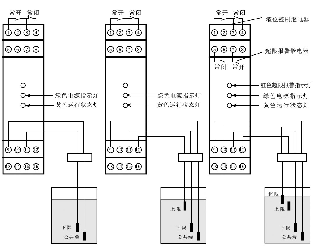 典型應用 1 .三根電:三根電常用,適合給排水和其他進液或排液控制,與機泵結合可以實現自動控制給排水。 進液控制: 液位低于下限時,繼電器吸合,黃色燈亮,水泵電機啟動; 液位高于上限時,繼電器斷開,黃色燈滅,水泵電機停止。 排液控制:液位高于上限時,繼電器吸合,黃色燈亮,水泵電機啟動; 液位低于下限時,繼電器斷開,黃色燈滅,水泵電機停止。 注意:進液、排液的功能切換是由內部撥動開關實現 撥動開關在1時為進液控制 2.四根電:四根電則是在進液或排液功能的基礎上增加了上限報警或下限報警功能,防止水位超高溢流或過低空泵運行。 |