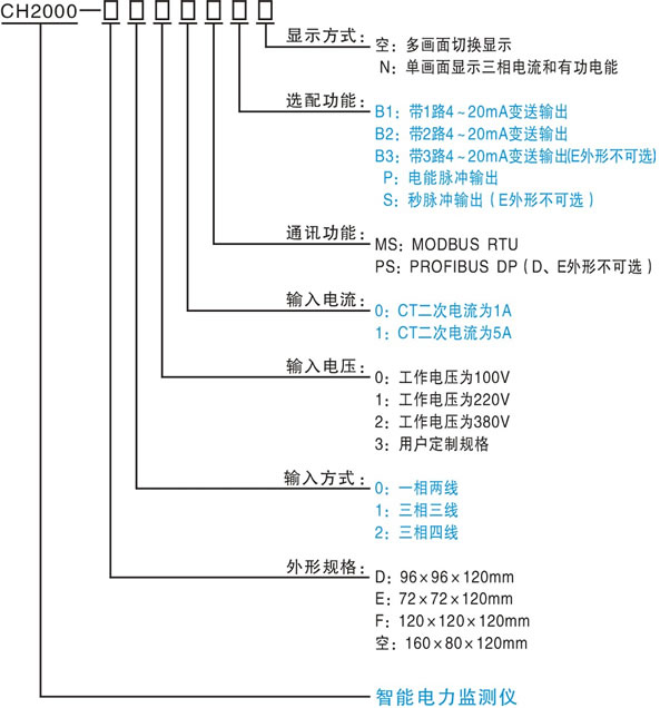 選型CH2000-211MSP表示儀表外形是160×80×120mm(其它外形 尺寸的選型在“CH2000-”后接外形規(guī)格對應的字母),三相四線 制,輸入電壓信號為220V,電流為帶ModBUS通訊,并且?guī)щ娔苊}沖輸出功能的多畫面切換顯示的智能電力儀表。