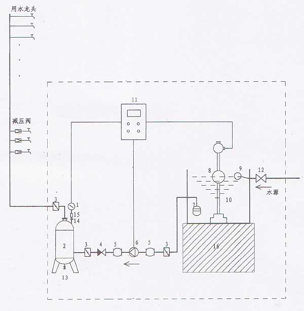 圖中,1.壓力變送器 2.儲壓罐 3.手動蝶閥 4.止回閥 5.橡膠軟接頭 6.水泵 7.底閥 8.水位控制儀 9.浮球閥 10.蓄水池 11.變頻控制柜 12.截止閥 13.儲壓罐排污閥 14表閥1 5.水壓阻尼器 16.蓄水池底座