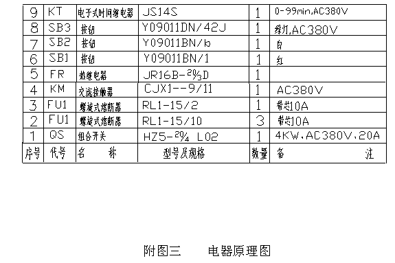 4. 電器控制箱(電氣原理圖見圖三):由按鈕、組合開關、熱繼電器、時間繼電器、組合開關等組成,研磨時間出廠時已調到場30min,用戶也可以根據物料研磨細度自由調整。當磨機停機后方可打開磨門,若磨門未對準罩殼門時用點動開關點動對準之。