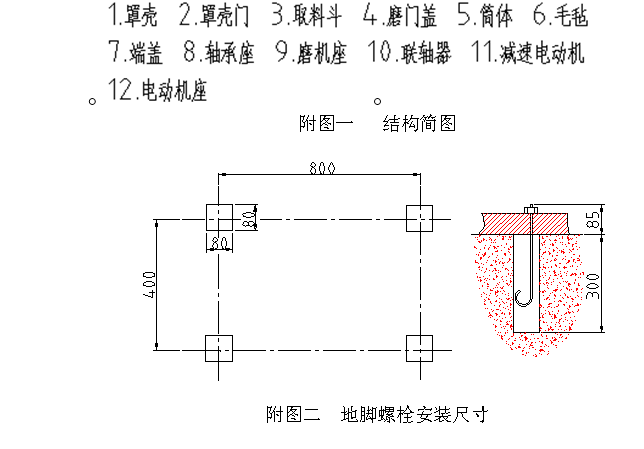 3. 支座:支座是由磨機(9)及電動機(12)組成的鋼結構,用以支承罩殼,磨機,電動減速機及電器控制箱等,磨機座底部有4 個Φ20底腳螺栓孔,用以固定全套設備。(地腳安裝尺寸見圖二)。