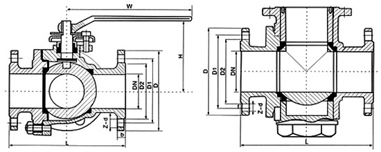 四、法蘭連接三通球閥國標連接尺寸和外形 PN1.6MPa :