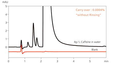 采用新開發的低容量混合器(20 µL)、樣品環進樣組件(選配件)、柱溫箱的微體積預熱器,將系統體積降低至約42µL以內(5µL環路使用時),縮短了快速梯度分析的周期。 在LC/MS分析中對常見的生物、食品等復雜基質成分分析時,如何降低源于非目的成分的背景噪聲和交叉污染因素是MS前端裝置LC的使命。Nexera SIL-30AC自動進樣器配備多可選擇4液的多重清洗機構,可靠地清洗進樣針的內外面,實現更穩定的LC/MS分析。 |