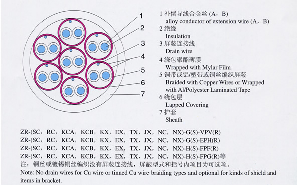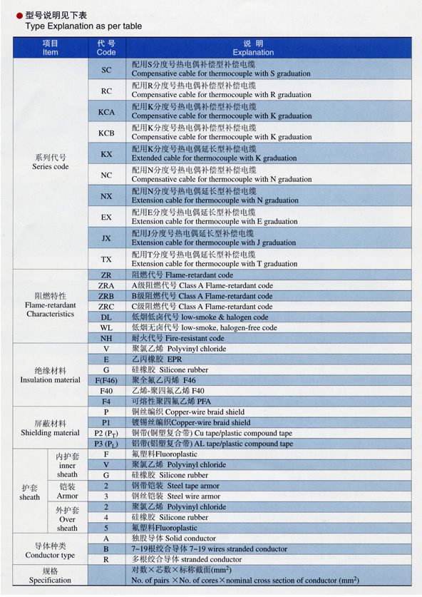 | 注:上述型號僅列出KX,其他如SC、KC、EX、BC、TX、JX只需改變型號一項即可, 阻燃型補償導線型號前加ZR,ZR192為進口PFA材料, 屏蔽可采用鍍錫銅絲屏蔽。 |