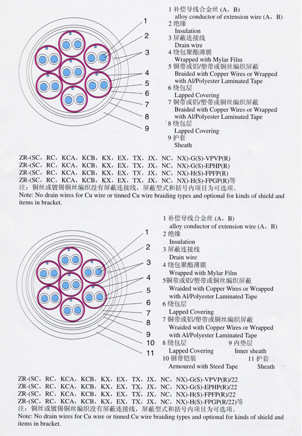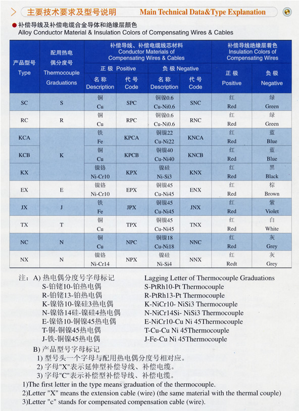 | 注:上述型號僅列出KX,其他如SC、KC、EX、BC、TX、JX只需改變型號一項(xiàng)即可, 阻燃型補(bǔ)償導(dǎo)線型號前加ZR,ZR192為進(jìn)口PFA材料, 屏蔽可采用鍍錫銅絲屏蔽。 |