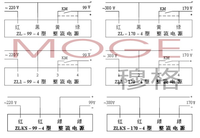 例:ZL–99–4為普通型,四端引出線式,輸出直流電壓為99V整流電源。