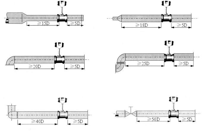 渦街流量計的安裝要求有一定的前后直管段,常見情況如下(D為管道的直徑):