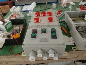 B、非標(biāo)配電箱:外殼采用鋼板焊接成型,表面噴塑。分主腔和接線腔,均采用隔爆型結(jié)構(gòu),內(nèi)可選裝高分?jǐn)鄶嗦菲鳌⒔涣鹘佑|器、熱繼電器、控制按鈕、信號(hào)燈等元件,通過(guò)操作殼蓋上的手柄實(shí)現(xiàn)分合,動(dòng)作性能可靠,并設(shè)有指示燈。進(jìn)出線采用鋼管或電纜布線均可,進(jìn)出線口方向及內(nèi)部元件可由用戶(hù)要求而定。