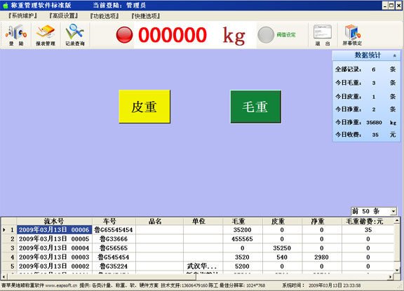 5、記錄查詢方便詳細,稱重記錄中可以以全部記錄、完成記錄、未完成記錄、 作廢記錄來分類顯示。也可以按日、周、月、季度、年、近幾天、任意時間段來顯示記錄內容,既可以按車號、貨物名稱、規格、司磅員等進行單項排序打印,也可以在條件選擇框中進行條件組合打印。并且在查詢的每條記錄的同時可以查看車輛上秤時的所有圖象作為比較。