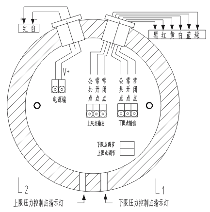 工作狀態指示方式:實際壓力≤下限設定值,L1燈亮。(L1為下限壓力控制點指示燈)