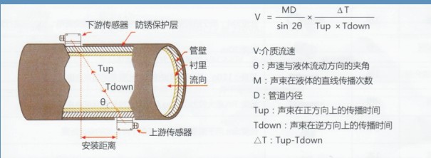 當超聲波波束在液體中傳播時,液體的流動將使傳播時間產生微小變化,其傳播時間的變化正比于液體的流速,零流量時, 兩個傳感器發射和接受聲波所需的時間完全相同( 可實際測量零流量的技術);介質流動時,逆流方向的聲波傳輸時間大于水流方向的聲波傳輸時間。其關系符合下面表達式。