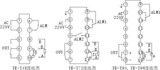 | 注:所有接線圖中OUT所指單元為主控輸出單元,其中開關狀態是指帶繼電器輸出狀態,+、-狀態是指連續電流,電壓輸出端子及接固態繼電器時的脈沖直流電壓輸出端子,接可控硅輸出時,-端子接控硅觸發,+端接控硅條一陽(或單相硅的陰),主控輸出接線圖例見下: |