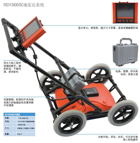 探測(cè)深度1, 1.5, 2, 3, 5, 8m可選、層狀濾波器、深度校正、土壤類型設(shè)定、里程計(jì)量設(shè)定