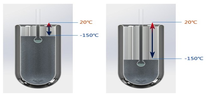 隨著液氮的揮發液位同樣品管的相對位置會發生變化,雖然采用液位傳感器和升降系統可以保持液位與樣品管相對位置不變,但是液位與杜瓦瓶瓶口的相對位置會發生變化,且該變化會引起死體積變化進而影響測試精度,如圖我們可以看到杜瓦瓶口到液氮液面始終存在著-150℃——20℃的溫差,該溫差隨著液氮杯的升降,始終影響著樣品管內死體積的校準。彼奧德電子引入溫差動態校準技術,已替代“等溫夾”技術,提高儀器測試精度;