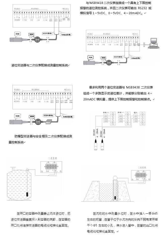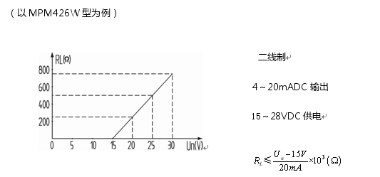 ①MPM436W型僅提供兩線制輸出形式的變送器,供電12~30VDC,負載<(U-12)/0.02A-Rwire(Ω),式中U為供電電壓,Rwire為導線電阻。