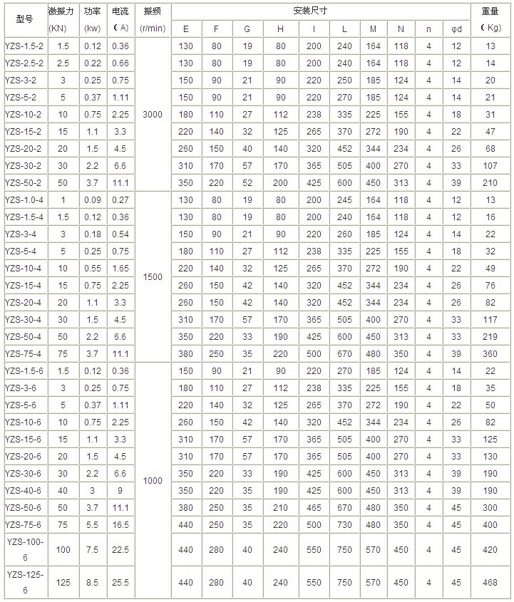 YZS系列振動電機(jī)技術(shù)參數(shù):