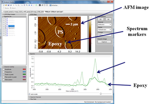 美國(guó)Anasys儀器公司的nanoIR軟件能夠很容易獲取納米尺度下吸收光譜。先,選定試樣的一個(gè)區(qū)域,采集AFM圖像,然后點(diǎn)擊你希望獲取紅外光譜的位置。該軟件能夠自動(dòng)記錄你所點(diǎn)擊的位置,從而讓空間形貌和光譜信息之間的聯(lián)系變得非常容易。同時(shí),光譜也很容易被輸送到第三方光譜分析軟件。