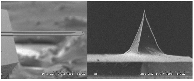 ThermaLeverTM探針區別于以往市面上的普通探針,它是一種批量生產的熱探針,主要成分為參雜硅。探針微懸臂的末端裝有加熱裝置,可使探針以一種可控的速率快速升溫至400℃。而普通探針則經常需要一些手工制作,或者由于電阻由金屬薄膜制成而僅能升至較低的溫度。此外,ThermaLeverTM探針的另一個重要是探針針尖的末端半徑。以前的熱探針末端半徑總是比標準AFM探針大很多。而 ThermaLeverTM探針提供的橫向分辨率則大大超過其他AFM探針。Anasys 公司有兩種型號的ThermaLeverTM探針,AN2-200和AN2-300.所有這些探針的的針尖高度在3μm到6μm之間,微懸臂厚度在2μm左右。AN2-300的彈簧常數較低,主要用于接觸模式。而AN2-200共振頻率較高,主要用于間歇接觸模式。下圖所示的是AN系列探針的SEM圖。左圖顯示了整個微懸臂的的形貌而右圖顯示的是針尖附近的形貌。