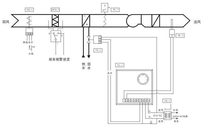 當盤管后的溫度低于某限值時,低溫保護開關TS-1切斷送風機的電源,從而使新風風閥關閉,防止盤管內(nèi)的水結冰,漲裂