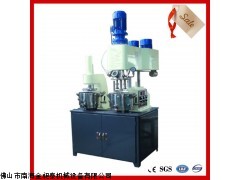 分散機采用變頻調速,可滿足各種工藝要求。分散機釜內有三根不同形式的攪拌器,其中一個攪拌器在繞釜體軸線轉動,其余兩個攪拌裝置又以不同的轉速繞自身軸線高速自轉,使物料在釜內作復雜的運動,受到強烈的剪切和搓合。設備內山形刮片繞釜體軸線轉動,將粘在壁上和底部的原料刮出參與混合,使其效果更為理想。設備密封性好,可抽真空,具有良好的排氣除泡效果.