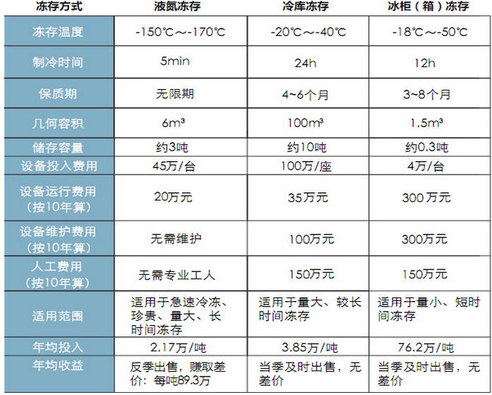 通過液氮凍存技術與傳統的凍存技術的對比,可以計算出液氮凍存平均每年投入約2.17萬/噸;凍庫平均每年投入約3.85萬/噸;冰柜(箱)平均每年投入約76.2萬/噸。不難看出液氮凍存技術有以下: