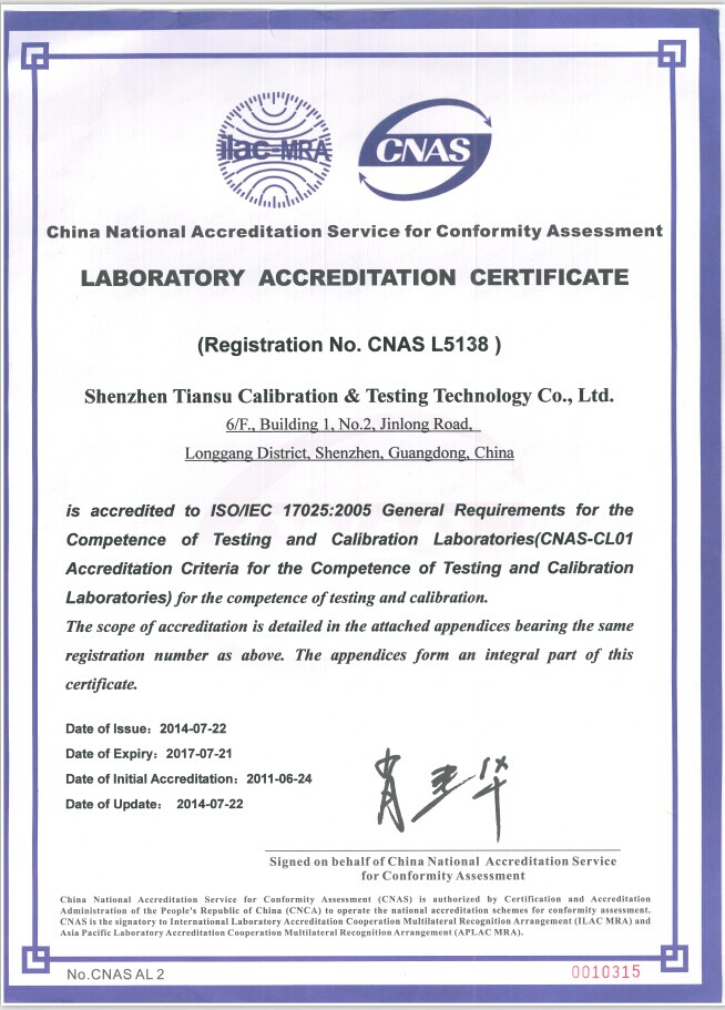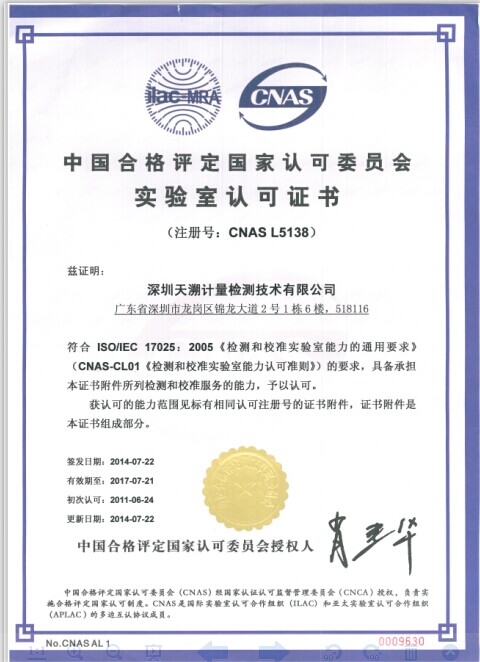 天溯計量校準中心是一家以法人資格,面向各省市提供第三方計量/校準檢測服務的專業檢測機構。本中心涉及有:幾何量(長度)、熱工、力學、 電磁、無線電、時間頻率、聲學、光學、化學等十大計量領域的器具的校準/檢驗。天溯通過合格評定認可委員會(CNAS)認可的校準實驗室,授權校準檢測項目多達416個項目。所出具的校準證書的量值都可以溯源到計量基準,并獲得到實驗室認可合作組織多邊互認協議(ILAC—MRA)其它成員的承認和認可。頒發的證書完全滿足標準化組織ISO、TS16949、QS或CNAS等認可體系的要求,即完全滿足ISO/IEC17025和ISO9000族的溯源性要求。具有公正性,可靠性,性。