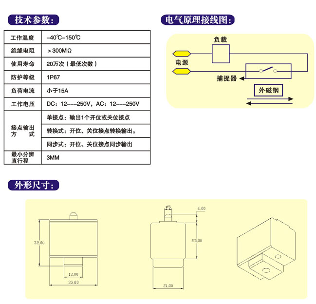 磁阻式接近開關WEF-QG 12-250V是通過磁鐵來感應的,這個磁 就是磁鐵,磁鐵也有好幾種,市場上面常用的磁鐵有橡膠磁、永磁鐵氧體、燒結釹鐵硼等。開關就是干簧管了。干簧管是干式舌簧管的簡稱,是一種有觸點的無源電子開關元件,具有結構簡單,體積小便于控制等優點,其外殼一般是一根密封的玻璃管,管中裝有兩個鐵質的彈性簧片電板,還灌有一種叫金屬銠的惰性氣體。平時,玻璃管中的兩個由特殊材料制成的簧片是分開的。當有磁性物質靠近玻璃管時,在磁場磁力線的作用下,管內的兩個簧片被磁化而互相吸引接觸,簧片就會吸合在一起,使結點所接的電路連通。外磁力消失后,兩個簧片由于本身的彈性而分開,線路也就斷開了。因此,作為一種利用磁場信號來控制的線路開關器件,干簧管可以作為傳感器用,用于計數,限位等等(在安防系統中主要用于門磁、窗磁的制作),同時還被廣泛使用于各種通信設備中。在實際運用中,通常用磁鐵控制這兩根金屬片的接通與否,所以又被稱為“磁控管”。