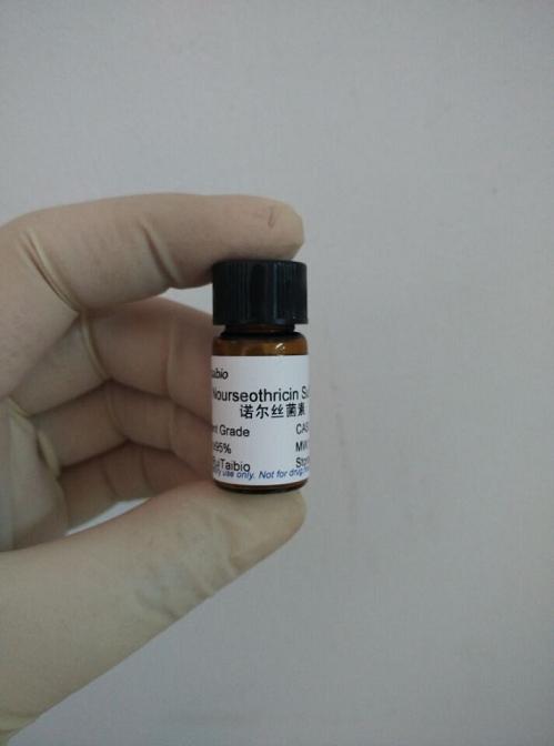 儲存液配制:稱量1000mg諾爾斯菌素溶解于5ml去離子水充分溶解后,用0.22µm濾膜過濾除菌,即制備200mg/ml儲存液,本溶液置于+4℃保存,至少4周穩定,不會有任何可見的活力損失。長期保存,分裝凍存于-20℃