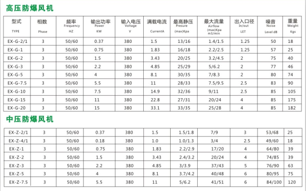型式 頻率(HZ)功率(KW)電壓(V)zui高靜壓(kpa)zui大流量(min/h)口徑(Let)噪音(dB)EX-G-2/150/600.3738013/161.4/1.51.2550EX-G-150/600.7538016/182.2/2.51.2557EX-G-250/601.538020/253.2/4.5275EX-G-350/602.238025/295/6.2277EX-G-/357/8.3280EX-G-7.550/605.538028/337.5/9.52.583EX-G-1050/607.538032/369/112.585EX-G-1550/601138027/3120/24485EX-G-2050/601538033/3525/28485中壓防爆風機EX-Z-150/600.753802.2/2.917/20464/80EX-Z-250/601.53802.4/3.220/24474/85EX-Z-350/602.23803/3.937/43576/90EX-Z-.7/4.240/48680/95EX-Z-7.550/605.53805/6.241/51684/100EX-Z-2/150/600.373801.5/1.87/9353/68EX-Z-4/150/600.183801.0/1.33/42.549/60