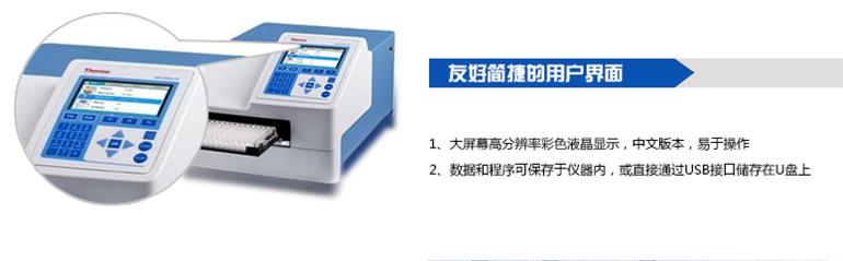 熱電FC酶標(biāo)儀大屏幕的彩色液晶顯示和操作鍵盤,易于使用。 3個常用的快捷鍵可用于儲存3個常用的程序。數(shù)據(jù) 和程序可保存在儀器內(nèi),也可通過儀器自帶的USB接 口,儲存在U盤上。