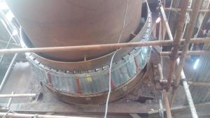 其次安裝立體法蘭,立體法蘭直徑要大于摩擦套60cm。立體法蘭上焊接連接套,連接套下方開一漏灰斗。連接套邊上焊接椎體法蘭,椎體法蘭環周均分螺絲孔距,用來密封件安裝。
