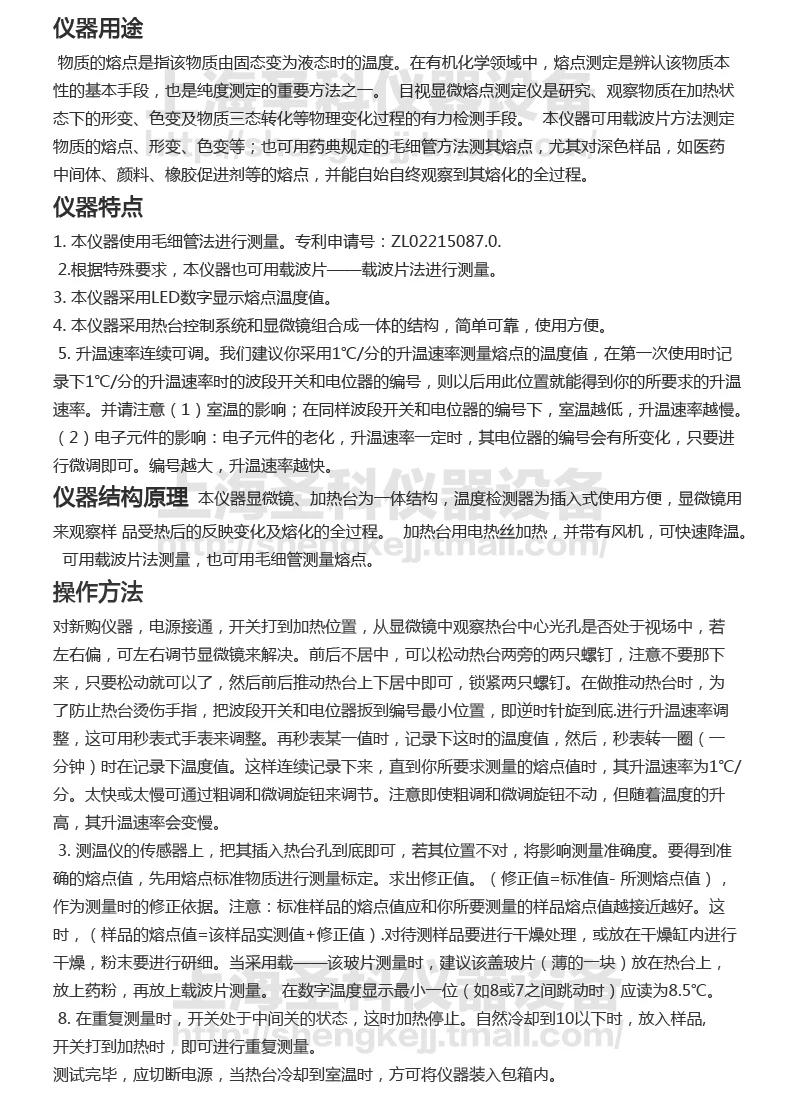 1.測定物質(zhì)的熔點。 2.主要用于藥物、化工、紡織、染料、香料等晶體有機化合物之測定,顯微鏡觀察。 3.既可用毛細管法測定,又可用載玻片-蓋玻片法(熱臺法)測定。 |