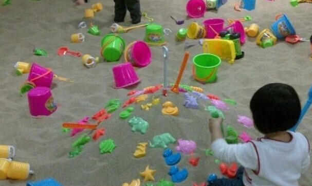 2、用小桶、小鏟、小碗、小瓶等容器裝沙、倒沙玩。可以鍛煉兒童的臂力,鍛煉身體。