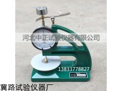 5、平穩地抬起測厚儀測量壓板,將一塊已備好的被測小樣放在測量壓板與支座之間,輕輕地放下測量壓板使其與試樣接觸。待測厚儀指針穩定后記錄百分表此時的讀數,然后計算此小樣的實際厚度。