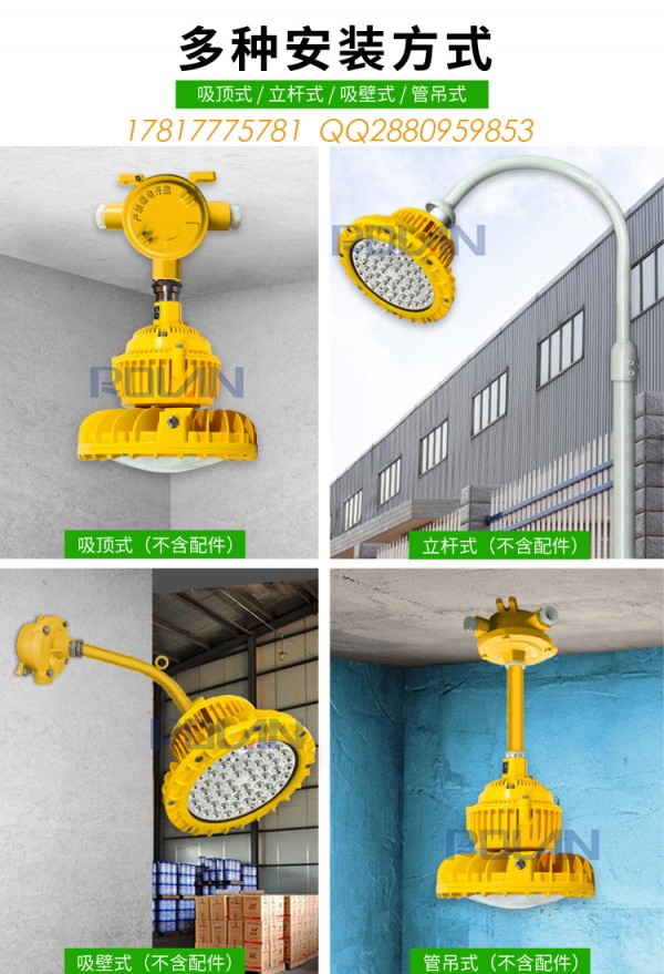 榮朗LED防爆燈安裝方式:吸頂式、路燈式、壁掛式、座 式、支架式、吊桿式、護欄式、吊鏈式、吸壁式燈、彎桿式等多種安裝方式可選。