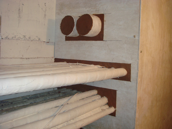 3、將堵料均勻地鋪、嵌、填于孔洞縫隙中,對于較大的孔洞,可先用防火網作骨架,以增加強度。