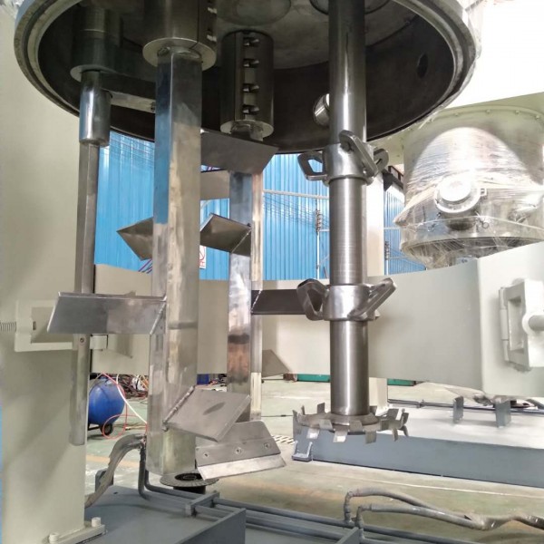 3.雙行星真空攪拌機釜體內壁為大型立車精加工,確保行星架上的活動刮刀在旋轉時,把釜體內壁上的物料完全掛掉;