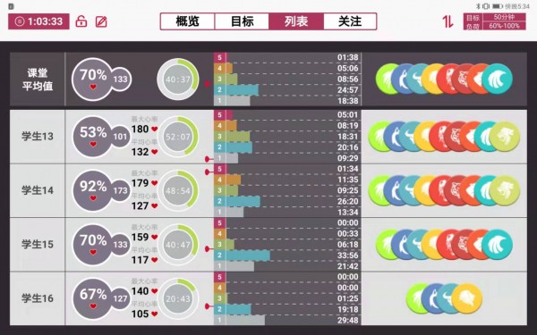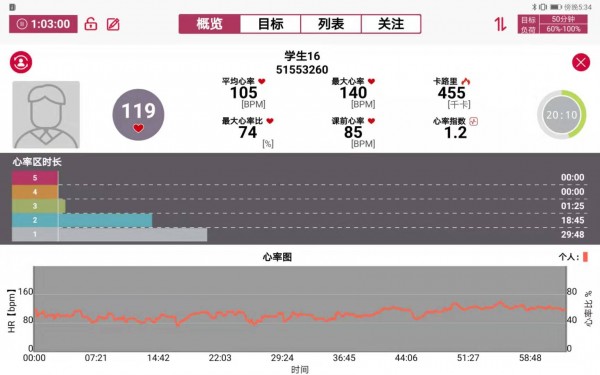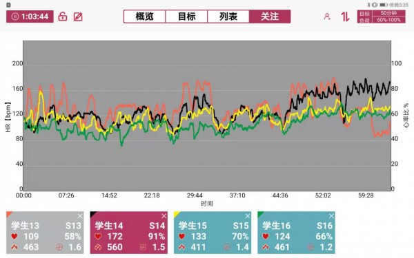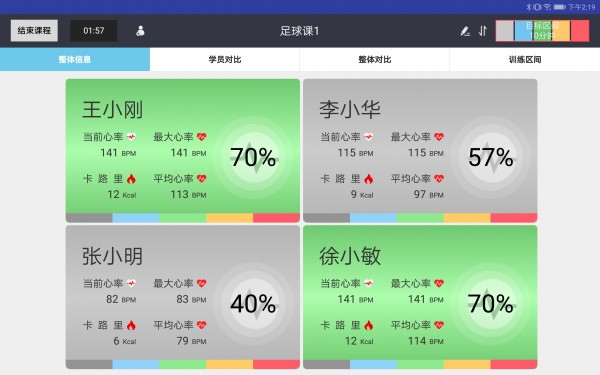 6、平板實時監測顯示所有人心率、大心率、運動強度(大心率百分比)、運動心率區、心率曲線、能量消耗、運動強度、運動強度指向等等。