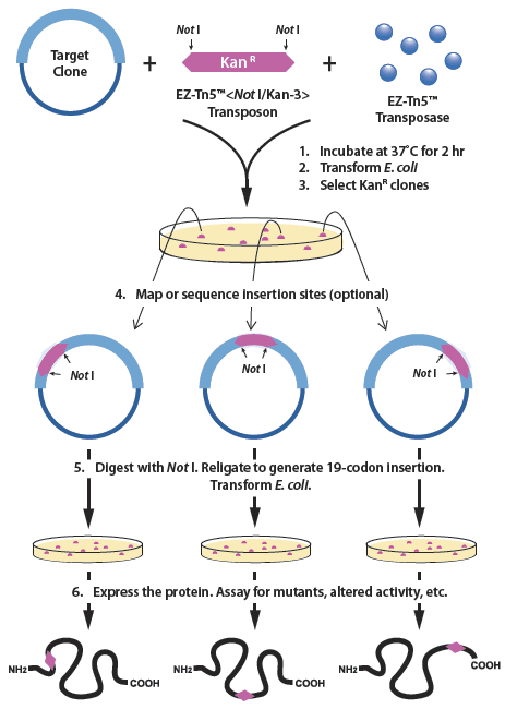 圖1該EZ-Tn5 In-frame linker Insertion Kit高度隨機的Tn5轉座系統。單一的體外反應生成數以千計的插入克隆,每個包含一個不同的轉座子插入。