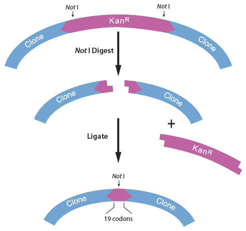 該盒子包括一個卡那霉素篩選標記,兩端是NotI位點。程序包括引入19個密碼子的克隆DNA插入片段,如圖1.一個簡單的體外酶反應,隨機插入一個EZ-Tn5 <Not I/KAN-3>轉座子到每個克隆中,產生>106卡那抗性插入克隆。插入的克隆可通過基因功能分析鑒定或通過轉座子插入位點的測序圖譜鑒定。所選擇的克隆,通過notI酶切,轉座子中存在卡那抗性(圖2)。